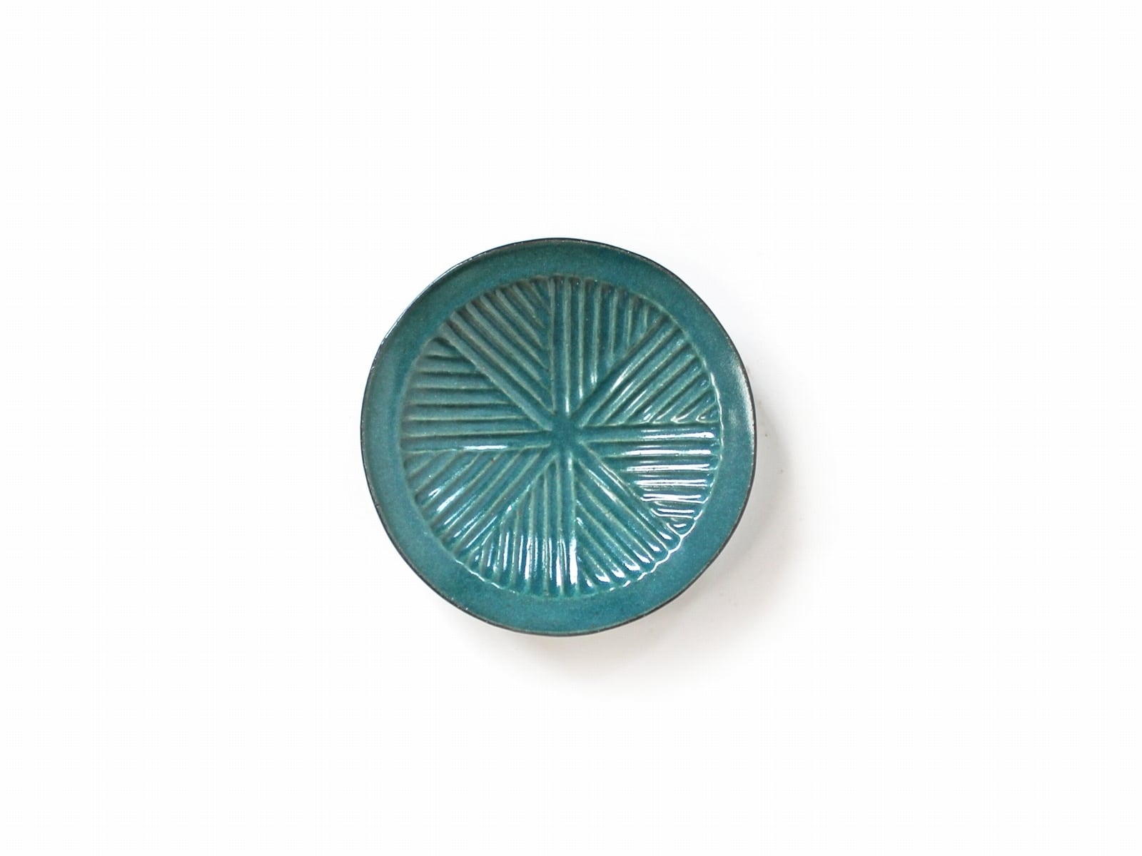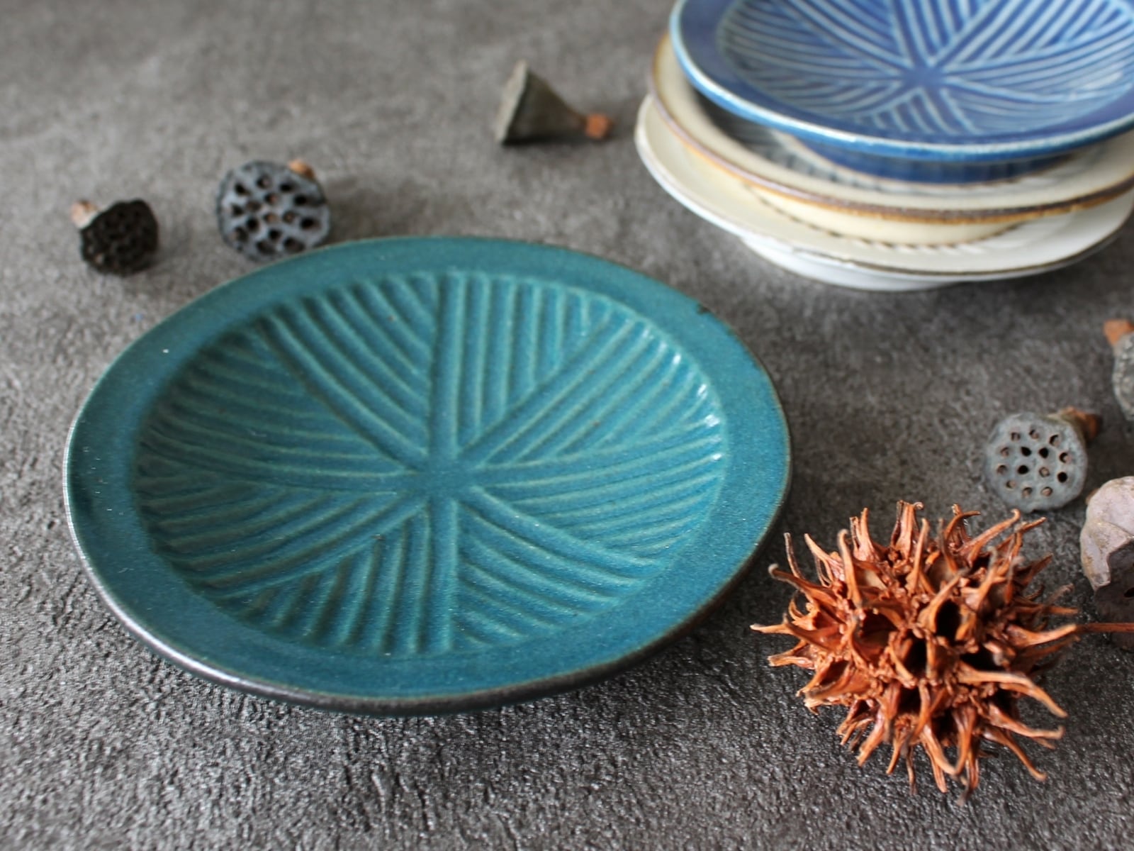 ※こちらのお色は、日本に古くからある伝統色の一つである「木賊色(とくさいろ)」と呼ばれる独特な深い青緑色に発色するオリジナルの釉薬を施しており、自然光や照明の当たり方によって色味が僅かに変わって見えるのが特徴です。